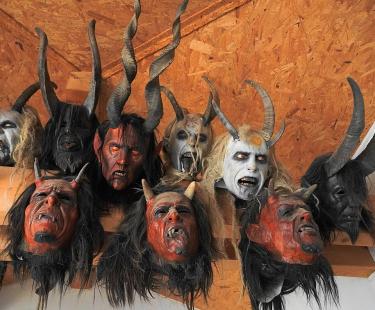 Image: Krampus masks on display in southern Austria. (Photo by Naturpuur / Wikimedia Commons.)
